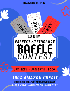 We’re excited to launch our 10-Day Attendance Challenge! Scholars who come to school 10 days in a row will be entered into a special drawing to win a $100 Amazon Credit. Consistent attendance plays a key role in academic success, and this challenge is a fun way to celebrate scholars who show up ready to learn each day. Thank you for your continued support in helping your scholar arrive at school on time and every day! Our first competition will begin January 12th and end January 26th (MLK Day- No School), and we will have our first drawing on Tuesday, January 27th.