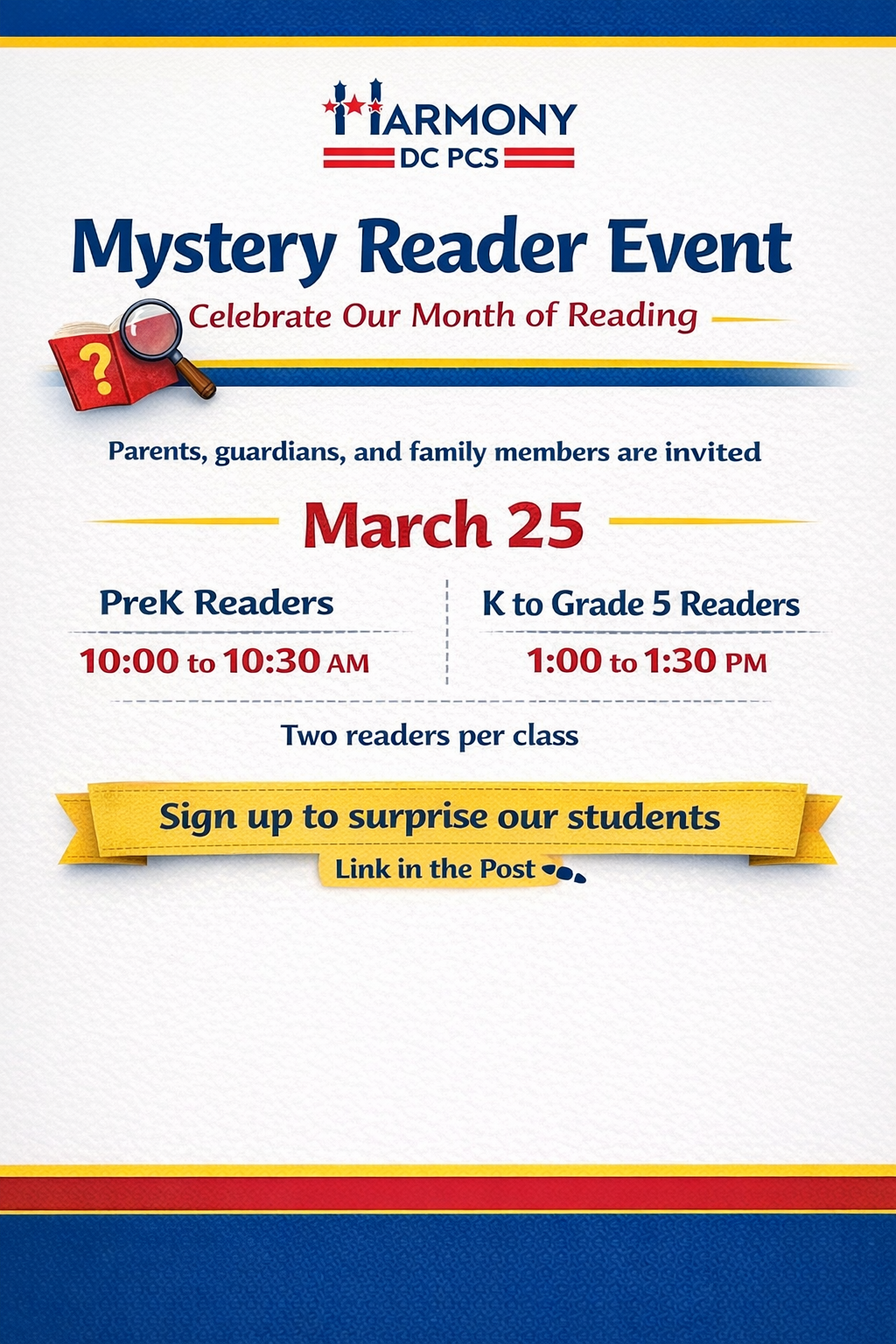 On March 25 we will host a Mystery Reader event and invite family members & friends to surprise our students by reading a short children’s book in their classroom.