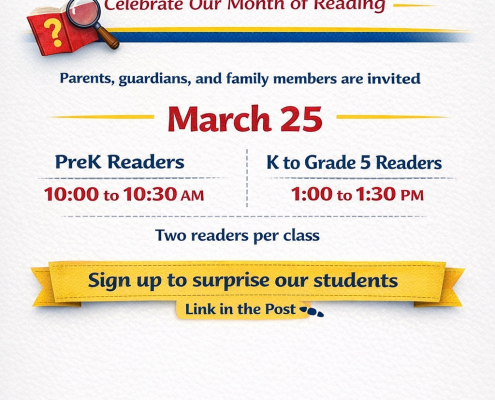 March will be our Month of Reading because one day simply is not enough to celebrate books. On March 25 we will host a Mystery Reader event and invite family members & friends to surprise our students by reading a short children's book…