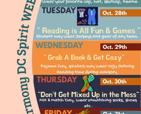 Dear Harmony DC Families, We’re excited to celebrate our love of reading with a fun and engaging Spirit Week from Monday, October 27th to Friday, October 31st! Each day has a special theme to encourage reading and school spirit. Here’s…